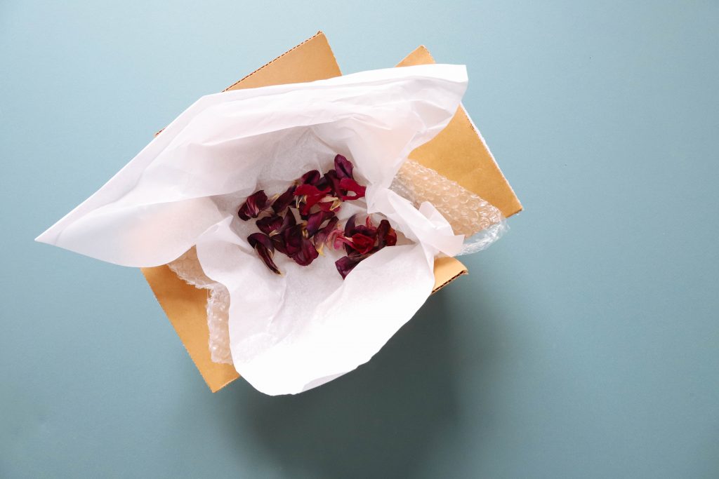 1. Prepare a box with bubble wrap on the bottom and sidesPlace dried stems, flowers, and/or flower petals into tissue paper. Make sure the organics are completely dry!